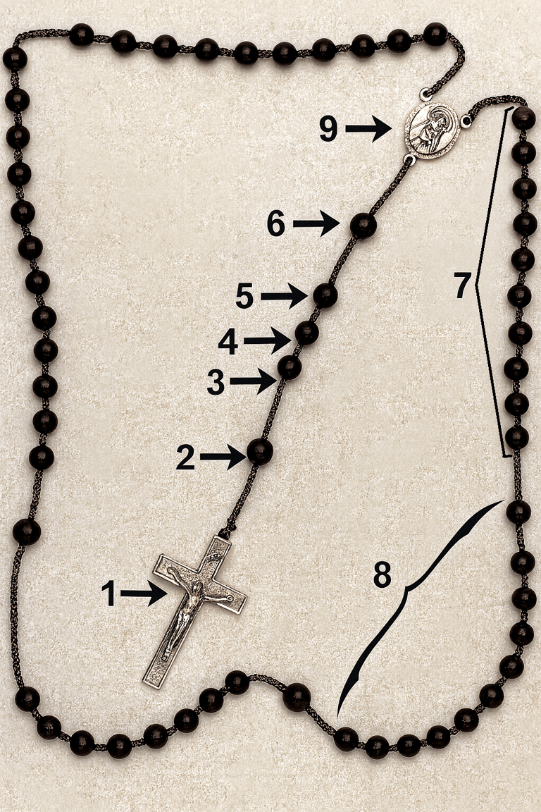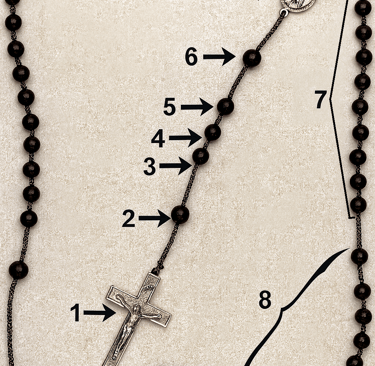 Saying the "Eternal Father" (6) on the "Our Father" bead and then 10 "For the sake of His sorrowful Passion" (7) on the following "Hail Mary" beads.